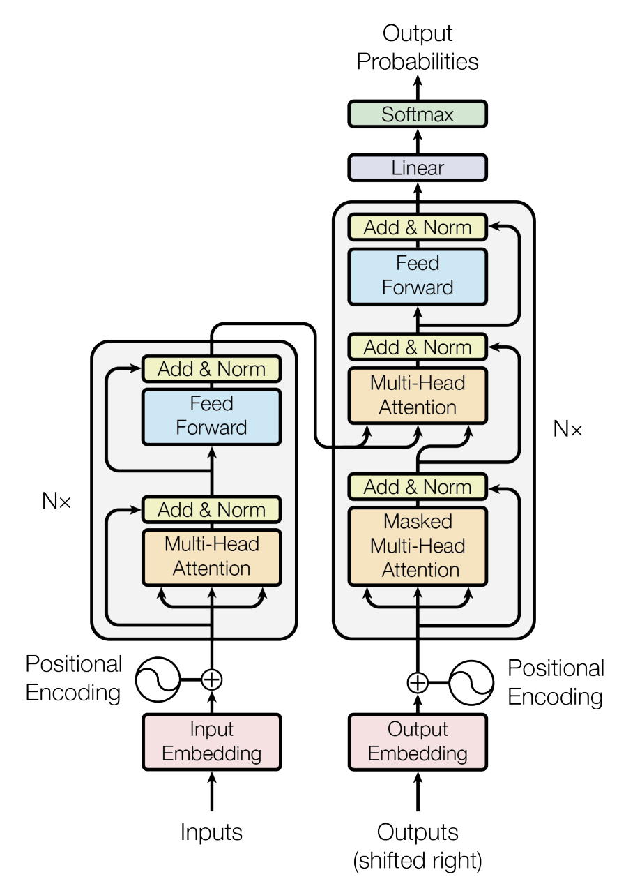 Now that we understand attention and multi-head attention, we can look at the overall Transformer architecture, which is divided into two main parts: an encoder (on the left in the image) and a decoder (on the right).