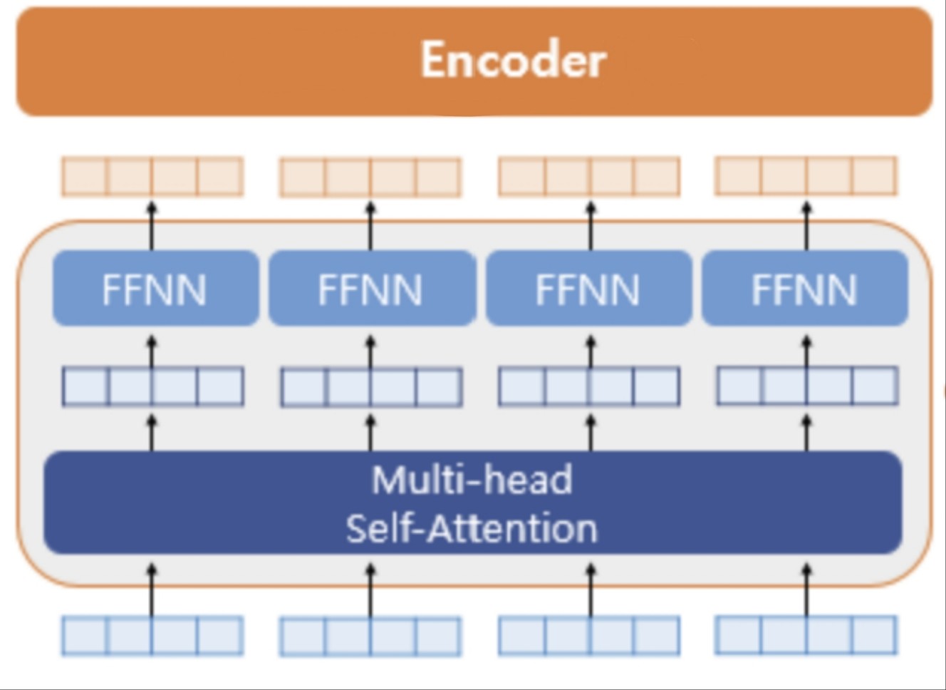 The encoder has six identical layers, and each layer contains two main sub-layers: multi-head self-attention and a feed-forward network (FFN).
