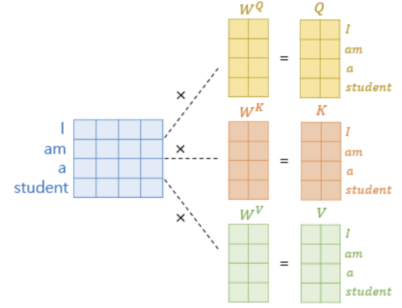 The input is linearly projected using learned weight matrices, producing with dimensions , , and , respectively.