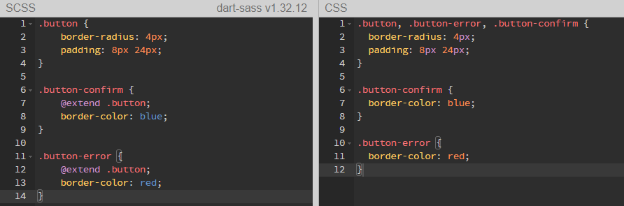 extend는 기본 스타일 선언이 필요한데(.button {...}와 같은) 이 스타일은 컴파일이 된다.