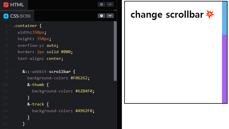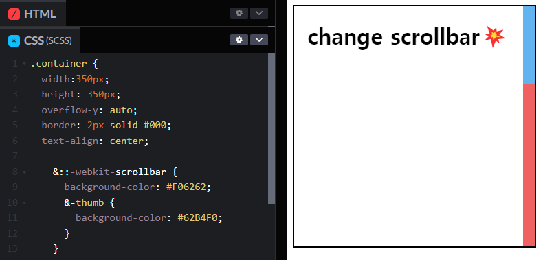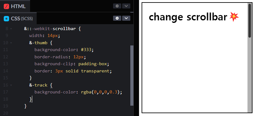 이렇게 scrollbar에는 width를 통해 원하는 너비를 설정해주고, thumb와 track으로 색상을 지정해주면 원하는 스크롤바를 커스터마이징 할 수 있다.