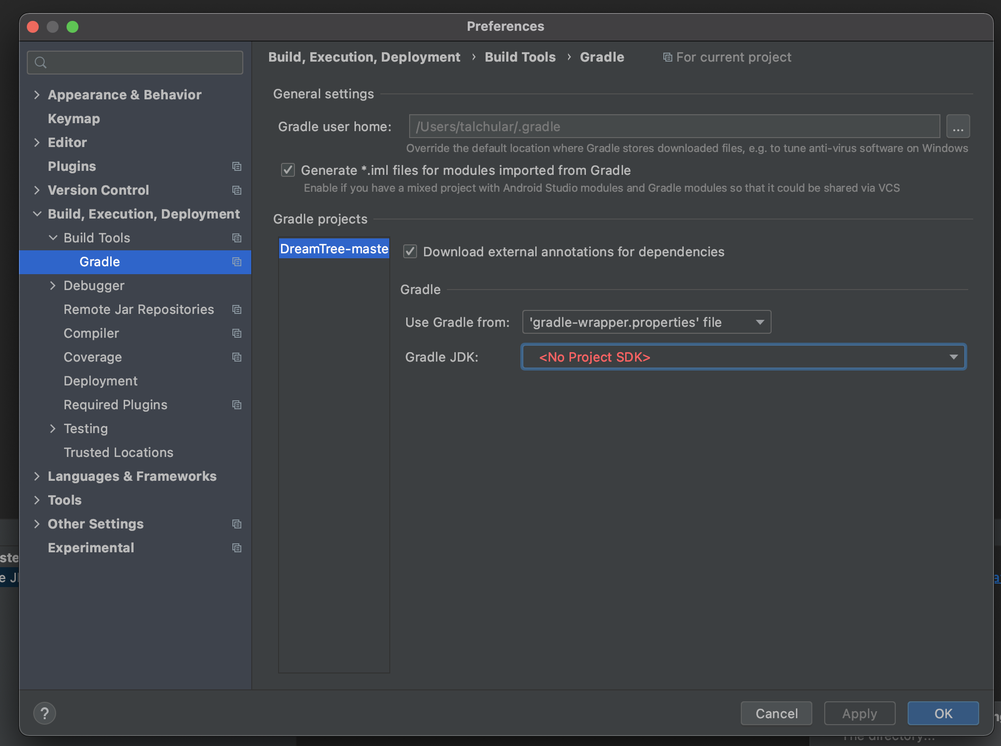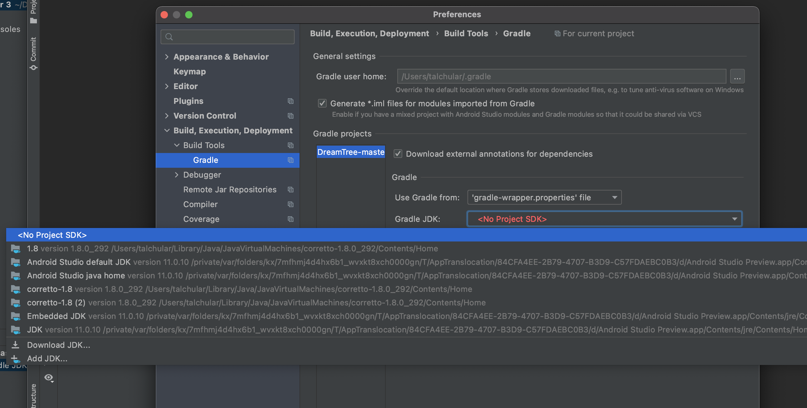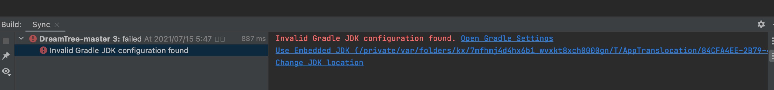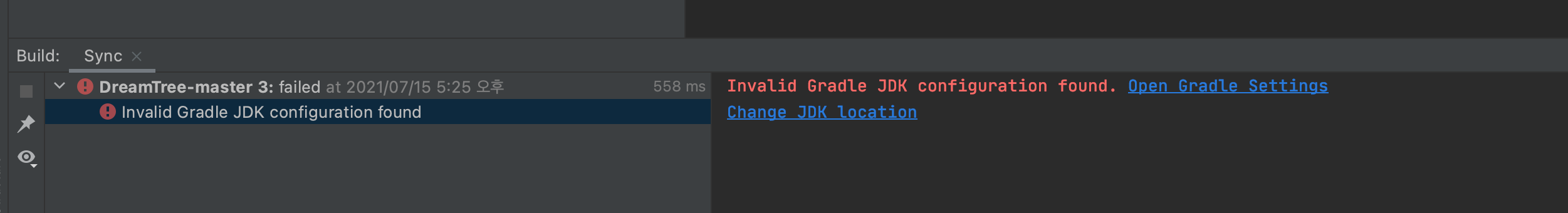 위와 같은 화면이 뜨게 되는데요 gradle JDK 에 빨간글씨로 되어있는 부분을 클릭해줍니다.