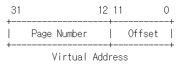 32bit 운영체제에서 가상 메모리 주소의 크기는 32bit이며, 이중에서 20bit는 페이지 번호로 사용하고, 12bit는 오프셋으로 사용합니다.