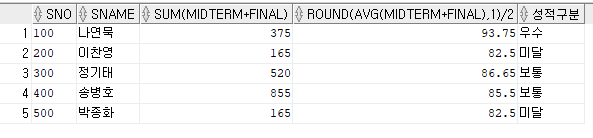 when( (round(avg(MIDTERM+final),1)/2) >= 90) then '우수'