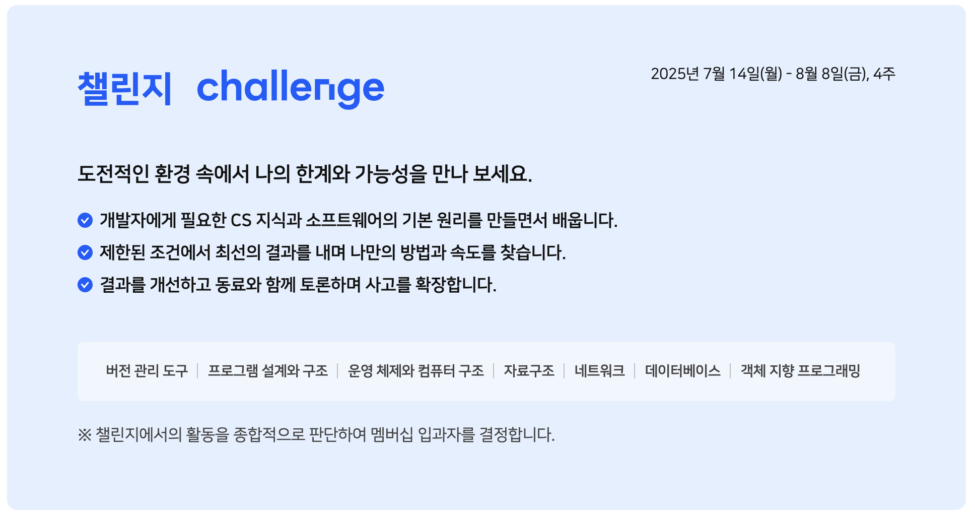 사실 이 문구를 보고 챌린지 입과를 선택했다고 해도 과언이 아닐 정도로.. 제 한계에 부딪혀보고 싶었습니다. 제 입장에서 프로그램을 간단히 요약해보면, 4주동안 이론적으로 알고 있던 CS 지식을 꺼내 실제로 응용해보고 개발해보고 원리를 이해할 수 있는 프로그램이었던 것 같아요.