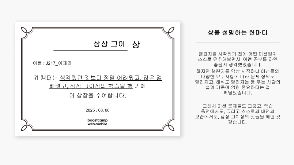 챌린지 과정을 경험하며 위 3가지 목표들을 그래도 제 기준에선 성취해낸 것 같아 만족스러운 것 같아요.
