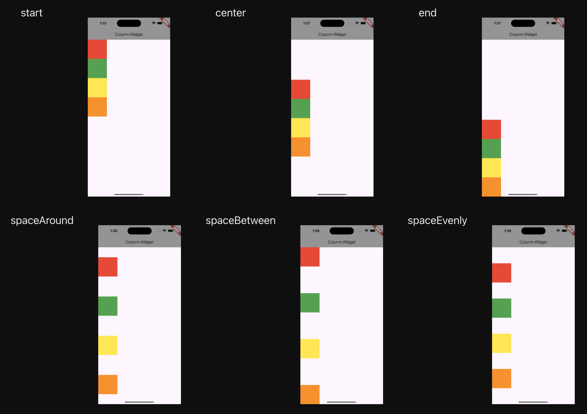spaceEvenly: 양 끝과 자식들 사이의 일정한 간격