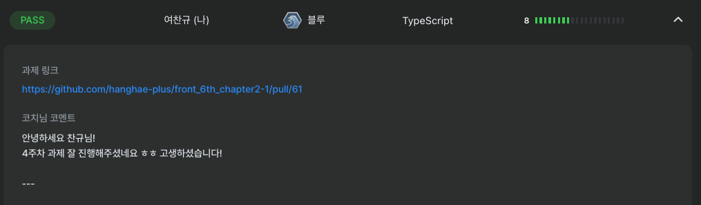 이번 주차도 과제에 시간을 많이 투자하지 못해 아쉬웠지만, 분명 얻어간 게 있다고 생각하고 있습니다.