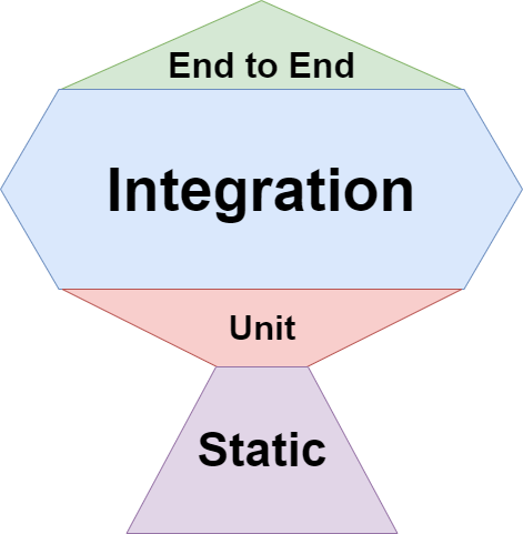 단위 테스트는 최소화하고, 통합 테스트를 가장 많이 작성하며, 핵심 시나리오만 E2E 테스트로 보완하는 방식으로, 실제 사용자 흐름을 안정적으로 보장하는 데 초점을 둔 테스트 분배 전략입니다.