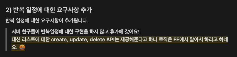 특히 이번 과제에서는 서버 개발자들이 휴가를 가버려서 반복 일정 로직을 프론트엔드에서 전부 구현해야 한다고 하네요?... (🔨)