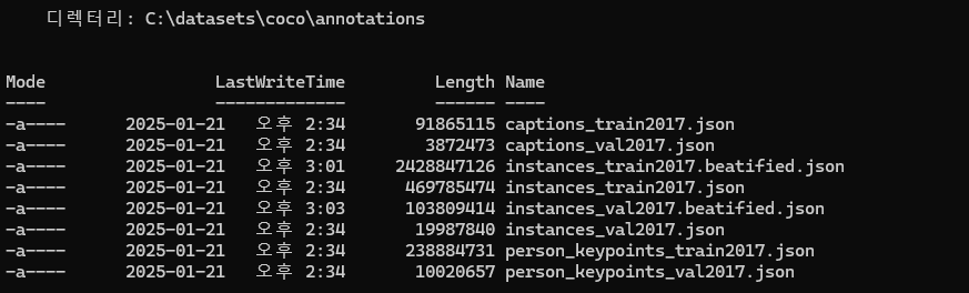 coco dataset format을 살펴보게 되면 annotations 디렉터리에는 아래 그림과 같이