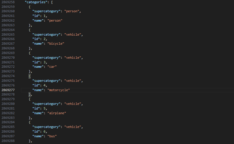 annotation은 json형식의 파일로 내부를 살펴보면 처음 다운로드 한 파일에서는 하나의 줄에 모든 정보가 들어가 있어 VScode 같은 IDE에서는 val같이 데이터 수가 적은 파일만 살펴볼 수 있는 등의 문제가 있어 해당 json파일을 보기 좋게 줄을 나누어주는 과정이 필요하다.(내부 데이터를 확인하지 않고 사용만 하려면 불필요함.)