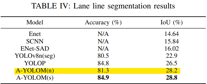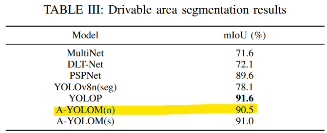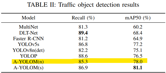 A-YOLOM(n) 모델에 대하여 인접하거나 살짝 낮은 결과값을 보임 loss값 추세와 결과물을 확인하였을 때 300Epoch 진행시 논문과 동일한 성능을 가질 것으로 예상된다.