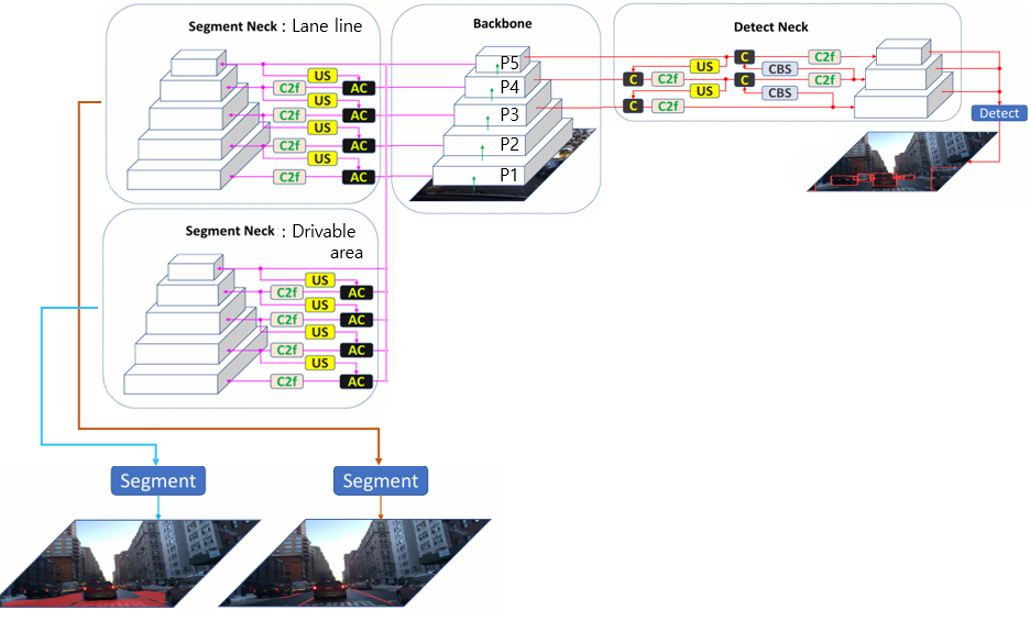 3개의 Neck을 활용 { lane lines, drivable areas, object detection }