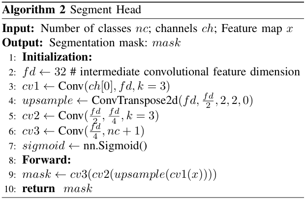 객체 탐지(L_det)에서는 DFL loss(Distribution Focal Loss), BCE loss(Binary Cross Entropy), CIoU loss를 조합하여 계산하는데 각각 class, Bbox, Bbox를 계산하는데 사용된다. 위 방식은 YOLOv8의 일반적인 객체 탐지 방법과 동일한 방식이다.