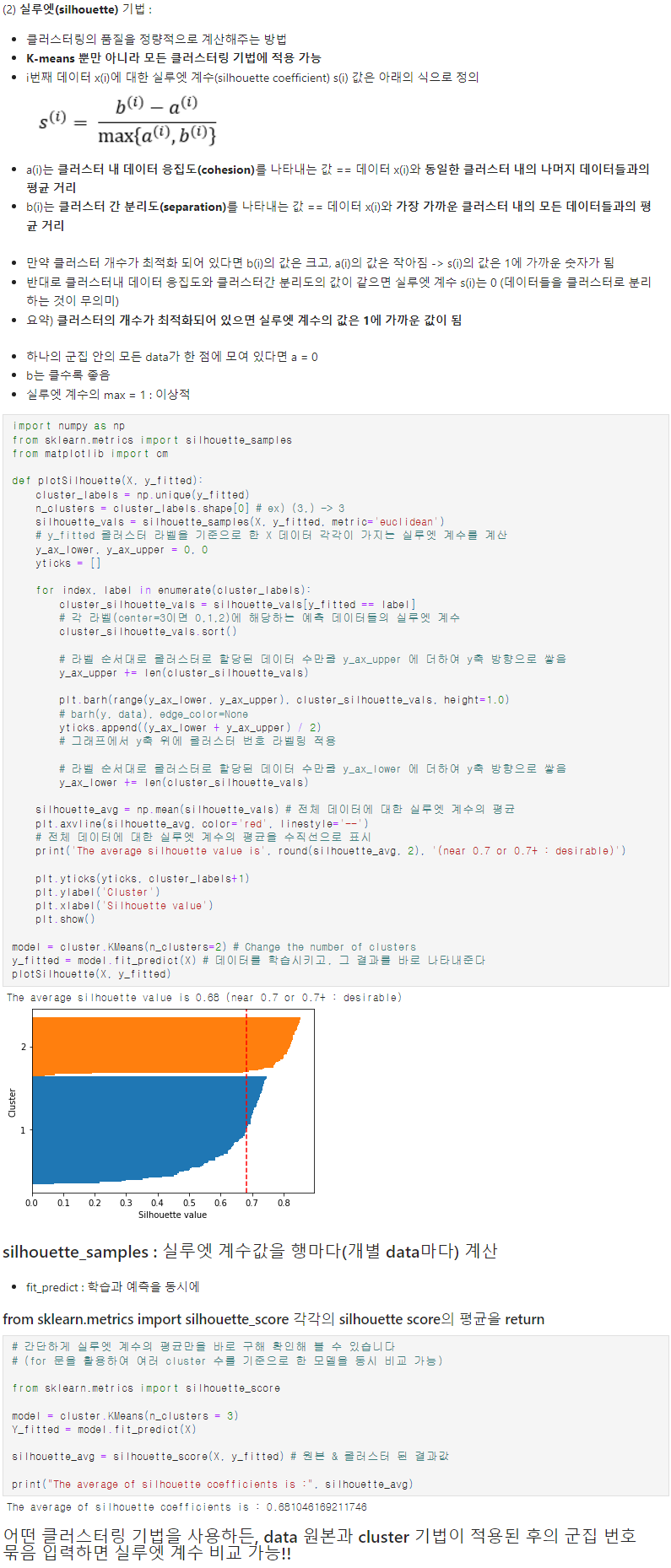 - 전체 실루엣 계수의 평균 : 0.7 이상이면 desirable (바람직함)