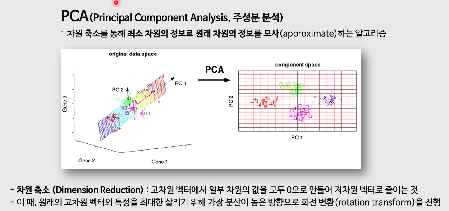전체 data 중 가장 분산이 높은 방향으로 회전 변환 진행 : 끝과 끝을 연결하는 벡터 & 그 축을 중심으로 직교하는 방향으로 데이터의 끝과 끝을 연결하는 벡터
