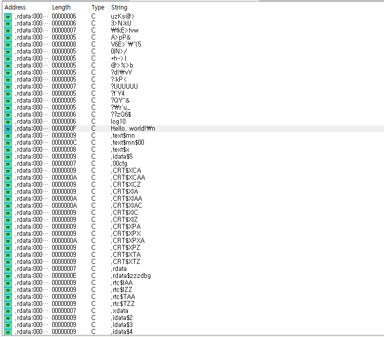 많은 문자열 중 "Hello, world!\n"라는 문자열을 찾아 더블 클릭