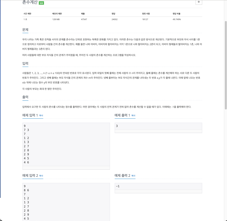 느낀점 : 전형적인 bfs문제이다. 물론 dfs로 풀이해도 전혀 문제가 없다. 하지만 재귀를 이용하는거보다 bfs를 이용하는 것이 일반적으로 성능상 좋다. start로 부터, end까지 촌수 계산을 하도록 문제를 구상하였고, 프로그래머스의 가장 먼 노드 문제와 매우 유사하다. 잘 이해가 안된다면 아래 링크 문제도 풀이하고, 그래프 탐색에 대한 이해가 깊어지길 바란다.