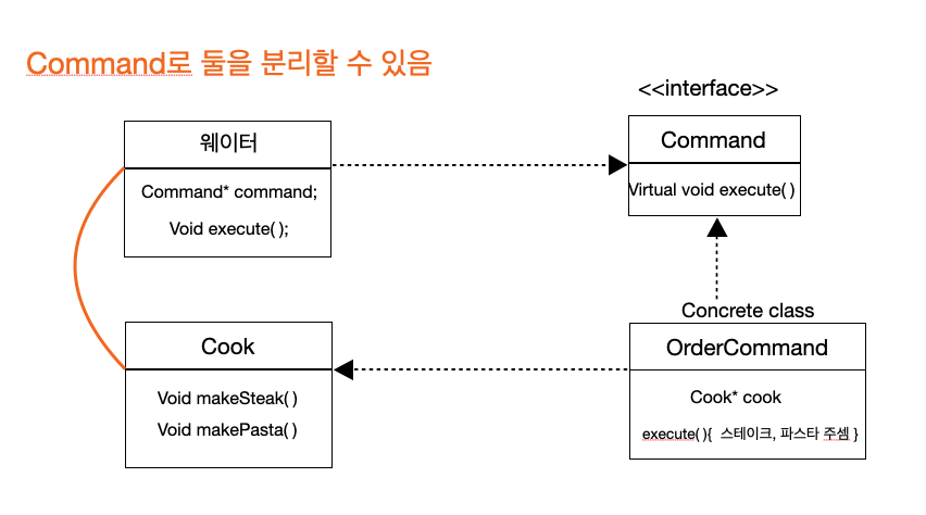 command 포인터에는 OrderCommand 객체의 주소가 있고 이에 접근하여 execute( )를 실행하므로 Cook에게 "스테이크랑 파스타 만들면 됨." 이라고 호출할 수 있다.
