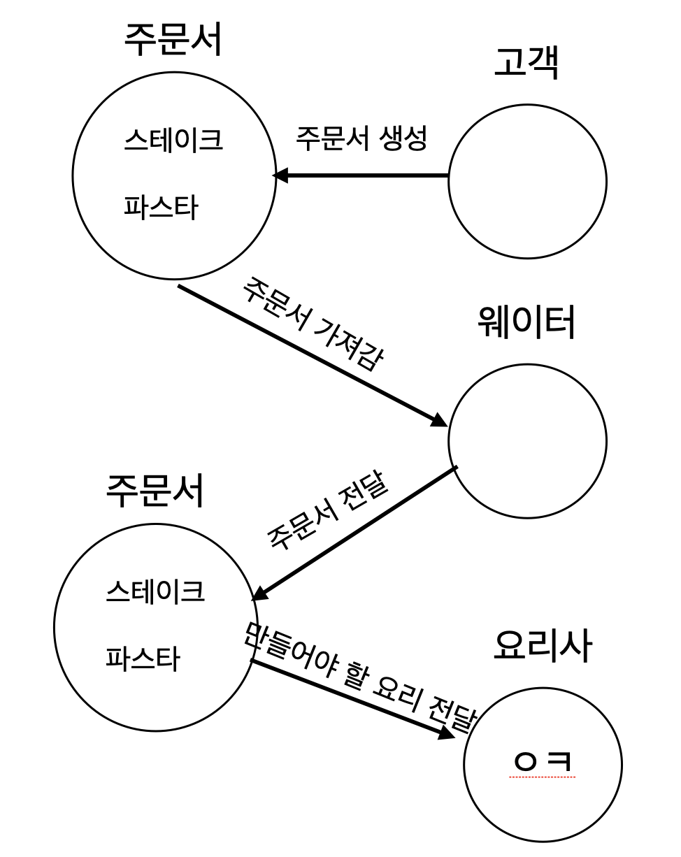 그리고 고객의 요청 사항을 이행할 객체가 필요하다. 예를 들어 위 예시처럼 스테이크와 파스타를 만든다고 해보면 다음과 같이 코드를 작성할 수 있다.