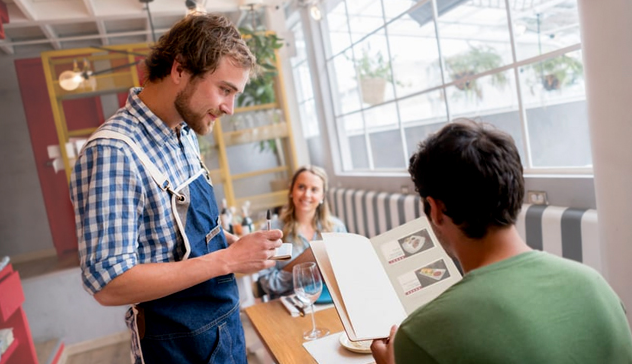 "웨이터: 주문서를 보고는 ~렇게 주문하시는 거 맞으시죠?"