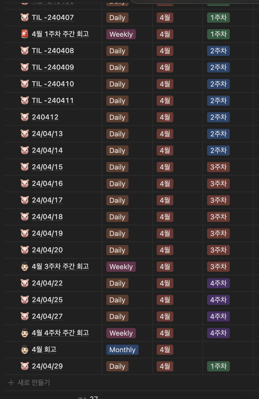 주 4회 이상 목표로 설정하고 진행하는 일, 주, 월, 분기 단위 회고