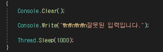 Thread.Sleep(1000);를 이용하면 "잘못된 입력입니다." 화면이 나오고 1초 뒤에 사라진다.