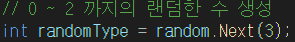 Next()메서드는 최소값(minValue), 최대값(maxValue) 사이의 값을 반환합니다.// 1 ~ 4 까지의 랜덤한 수 생성 Random random = new Random(); int randomCount = random.Next(1, 5);