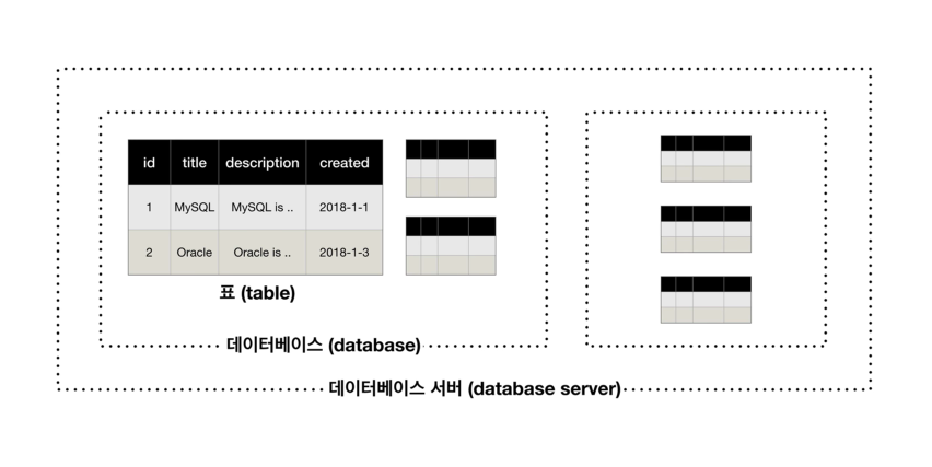 같은 종류의 여러 데이터를 table로 grouping 할 수 있고 여러 table을 database(schema)로 grouping할 수 있다. 이 때 서로 연관된 database들을 database server로 grouping 할 수 있다. mysql은 이러한 database server 전체를 설치하고 관리하는 DataBase Management System이다(DBMS).