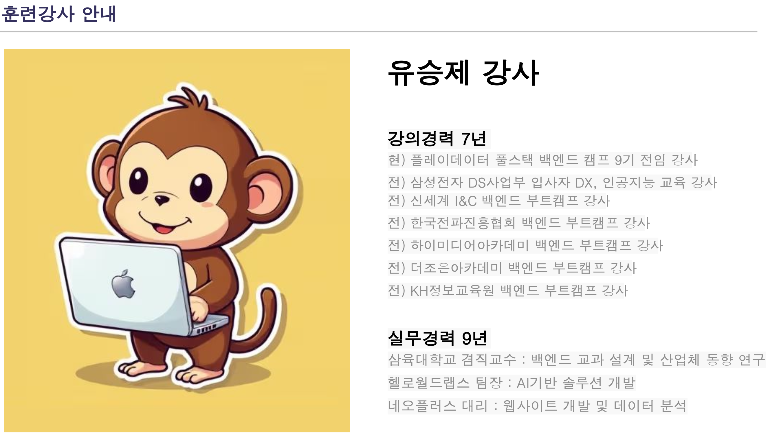 • 강사님께서 비전공자, 전공자 가릴거 없이 모두에게 정말 많은 관심을 가져주시고 알려주셨고 비전공자인 나로서 많은 어려움이 있었지만 강사님께서 꼼꼼히 하나하나 알려주신 덕분에 많은 도움이 되어 비록 어렵지만 너무 좋았다.
