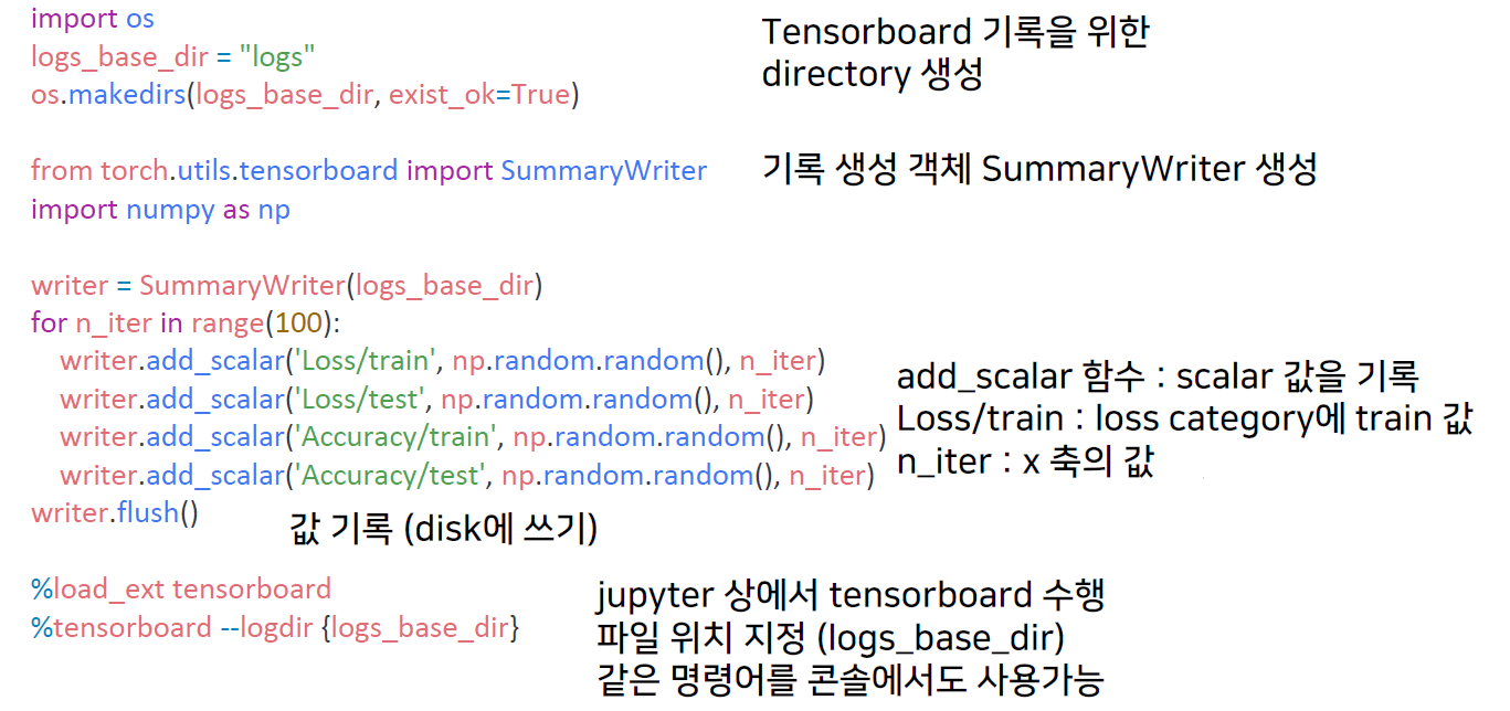 - SummaryWriter() 모듈 호출하여 기록할 위치만 지정
