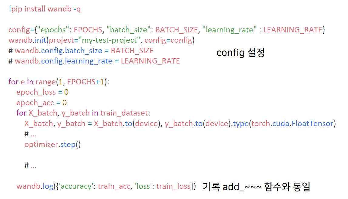 - 이후 wandb.log를 통해 tensorboard의 add_처럼 사용 하면 됨