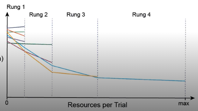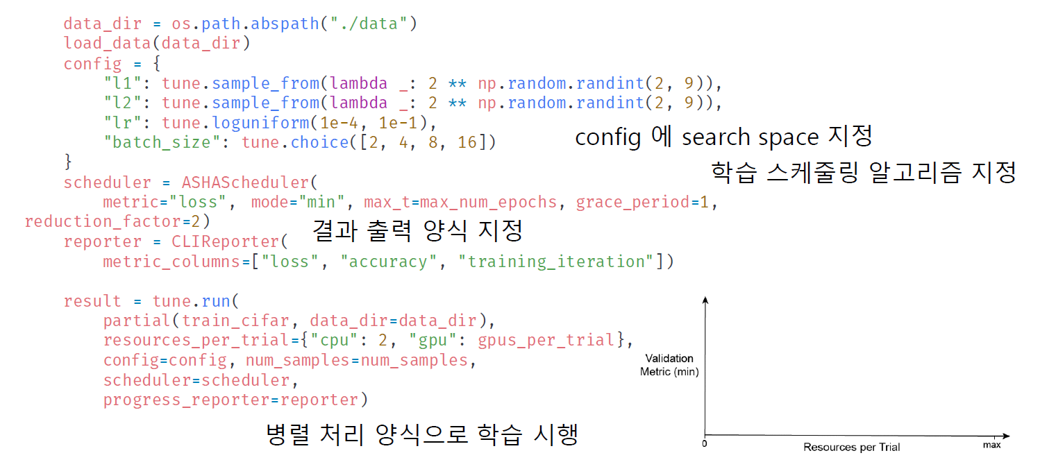 ASHA(Async Successive Halving Algorithm) Scheduler : early stopping 조건 지정, 알고리즘이 실행되며 중간중간 의미 없는 metric들을 잘라냄