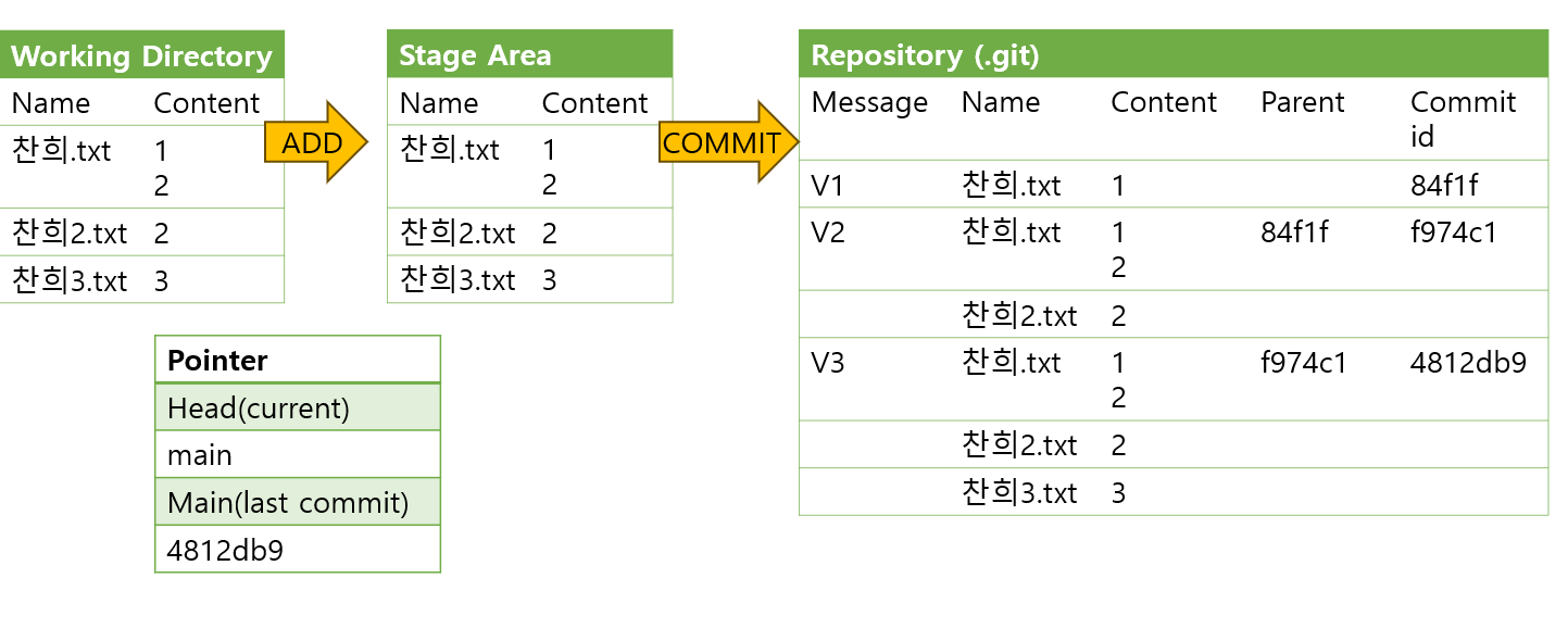 COMMIT : workng directory -> stage areacommit ID : Repository에 저장되는 정보를 기반으로 ID가 생성됨