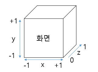 -1 ~ +1, 세로 Y좌표-1 ~ +1, Z좌표0 ~ 1의 형식으로 정규화된 형태로 좌표를 찍는 것을 말한다. 가로세로 -1 ~ +1사이의 값을 사용해서 해상도 비율에 맞게 픽셀의 위치를 계산하기 때문에 여러 해상도에도 적응할 수 있고, 정규화 되어있는 수치를 사용하기 때문에 성능 향상에도 도움이 된다.
