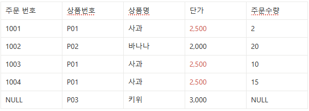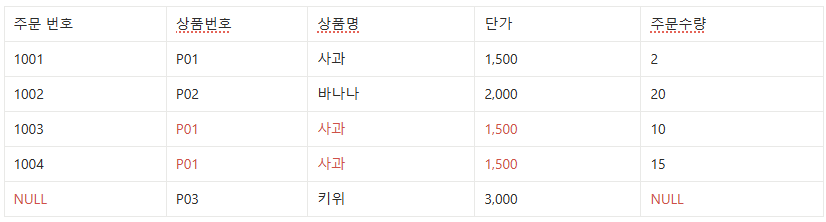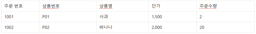 상품명이나 단가와 같은 속성의 값들이 변경될 경우 같은 상품은 빠짐없이 모두 수정해 주어야 한다.