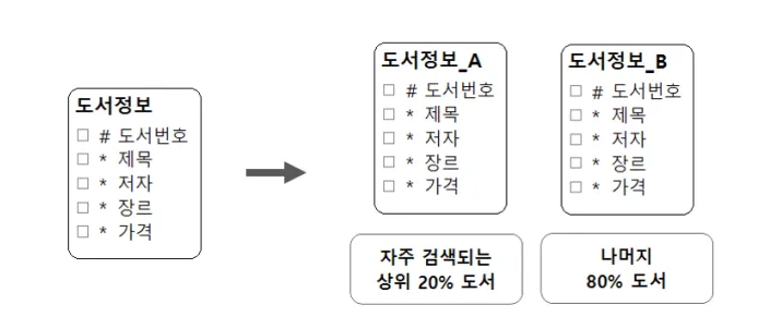 - 수평 분할 결과로 나온 엔터티 중 도서정보_A는 자주 검색되는 상위 20%의 도서이고 도서정보