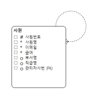 - 참조관계 : 엔티티간에 연관성이 존재하긴 하지만 다른 엔티티가 없다고 존재할 수 없는 관계는 아니다. 단순히 참조 데이터를 관리하므로 관계를 삭제해도 한 속성에 대한 연관성만 문제가 되고 하위 엔티티 존재에는 지장이 없다.