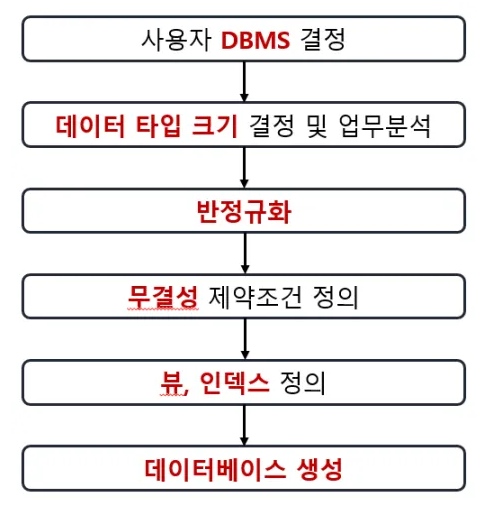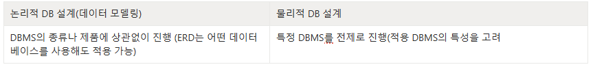 - 실제로 데이터베이스에 이식할 수 있도록 모델의 구조보다는 인덱스, 뷰, 테이블 타입과 사용하는DBMS와 같은 물리적 요소에 집중하여 데이터베이스를 설계하는 단계이다.