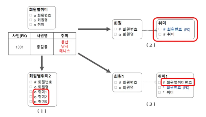 - (1)의 경우와 같이 속성을 추가해서 인스턴스별로 하나의 속성에 하나의 값이 들어갈 수 있게 할
