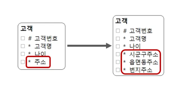 - 주소라는 속성은 여러 속성이 하나로 묶인 복합속성의 의미가 될 수 있다.