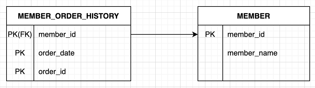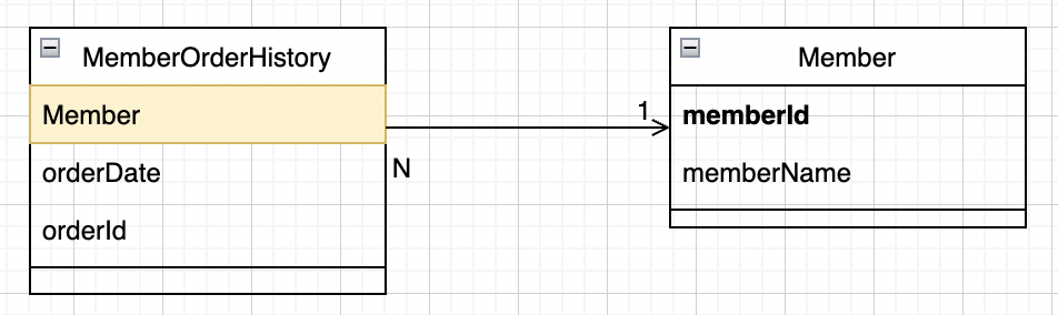 아래의 이미지는 이번 포스팅에서 예시를 들기 위해 설계한 1:N 관계의 엔티티 입니다. 회원을 의미하는 Member 와 회원별 주문내역을 다루는 MemberOrderHistory 로, 우선은 각각이 갖는 Id 값인 memberId 와 orderId 를 이용해 식별된다고 가정하겠습니다. 이 때 연관관계의 주인은 N-side 의 MemberOrderHistory가 되겠습니다.