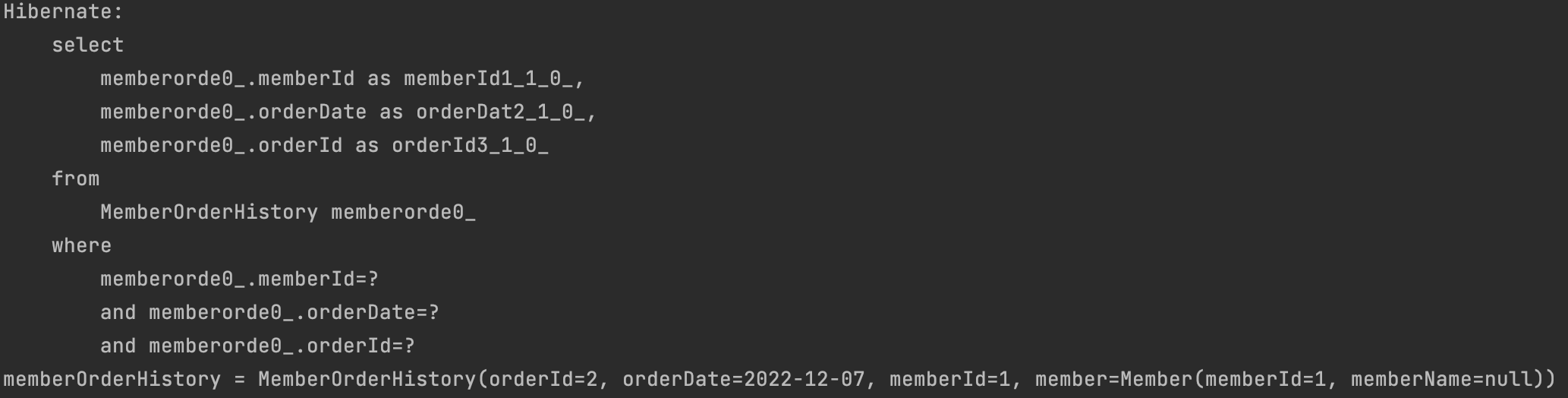 이렇게 엔티티를 수정한 뒤 em.find(MemberOrderHistory.class, memberOrderHistoryPK) 명령어를 이용해 MemberOrderHistory를 조회해보면 아래와 같이 복합키를 이용해 원하는 객체를 DB에서 조회해오는 것을 확인하실 수 있습니다.