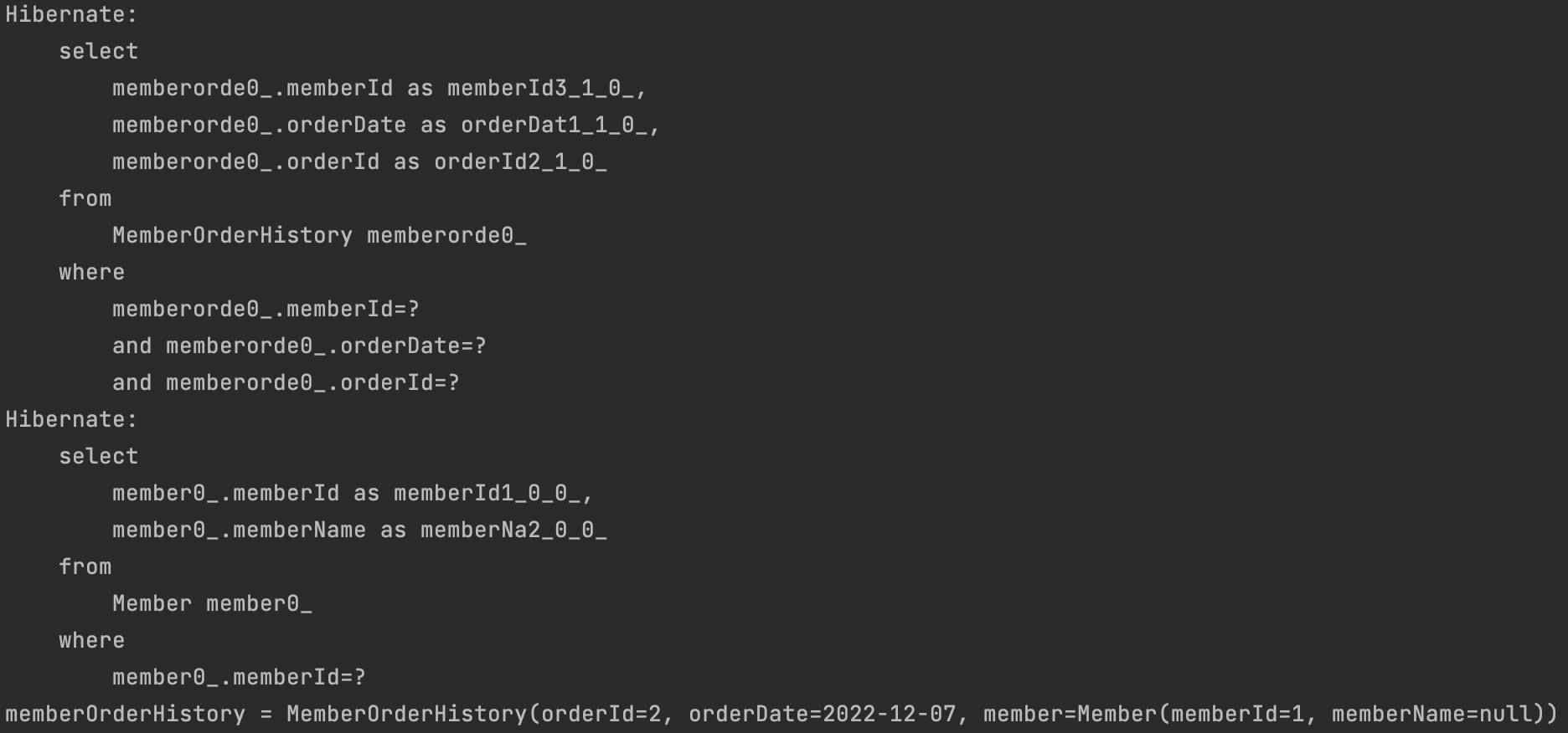 위와 같이 엔티티를 한번 더 수정해준 뒤 같은 명령어를 이용해 MemberOrderHistory 를 조회해보면 아래와 같이 한번의 SELECT 쿼리에 원하는 객체를 조회해올 수 있음을 확인할 수 있습니다.