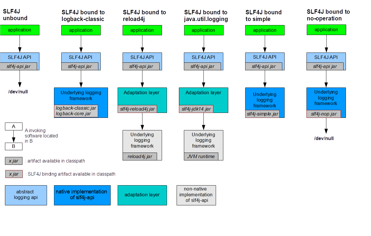앞서 SLF4J 가 다양한 로깅 프레임워크의 API를 제공해준다고 언급했는데, 이러한 이유로 SLF4를 사용하면 구체적인 로깅 프레임워크가 변경 되더라도 코드에는 별다른 수정이 필요하지 않게 됩니다. 이를 구체적으로 이해해보면 SLF4J 는 deployment time에 로깅 프레임워크(구현체)와 바인딩 되기 때문에, 경로에 위치한 .jar 파일을 바꿔주는 것으로 간단하게 로깅 프레임워크를 변경할 수 있다는 것입니다.
