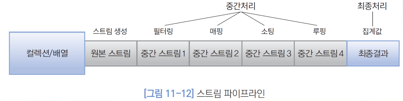 컬렉션, 배열, 또는 파일로부터 생성된 스트림에 어떤 처리를 수행하고 새로운 스트림이 만들어지며, 계속해서 이러한 처리 과정을 반복하는 것