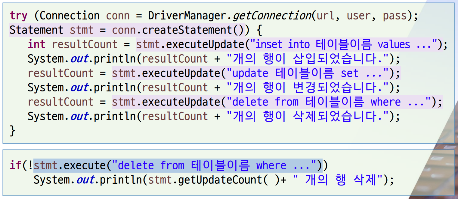 int executeUpdate(String sql) | update, insert, delete 구문을 실행할 때 사용되며, 영향받은 행의 개수를 반환 |