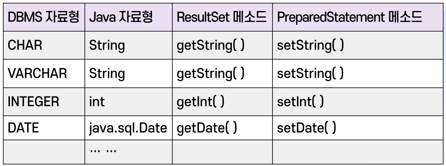 DMBS와 Java의 자료형 변환DBMS 테이블에서 필드의 자료형과 Java의 자료형, 그리고 JDBC 메소드 간의 관계