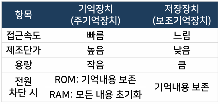 - 역할에 따라 주기억장치, 보조기억장치로 구분